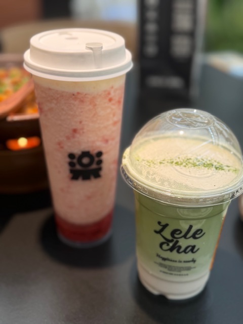 在一顿饱餐之后,两杯不同风味的奶茶为这顿饭画上了完美的句号。一杯是清新的草莓冰沙,另一杯则是浓郁的抹茶奶茶。
